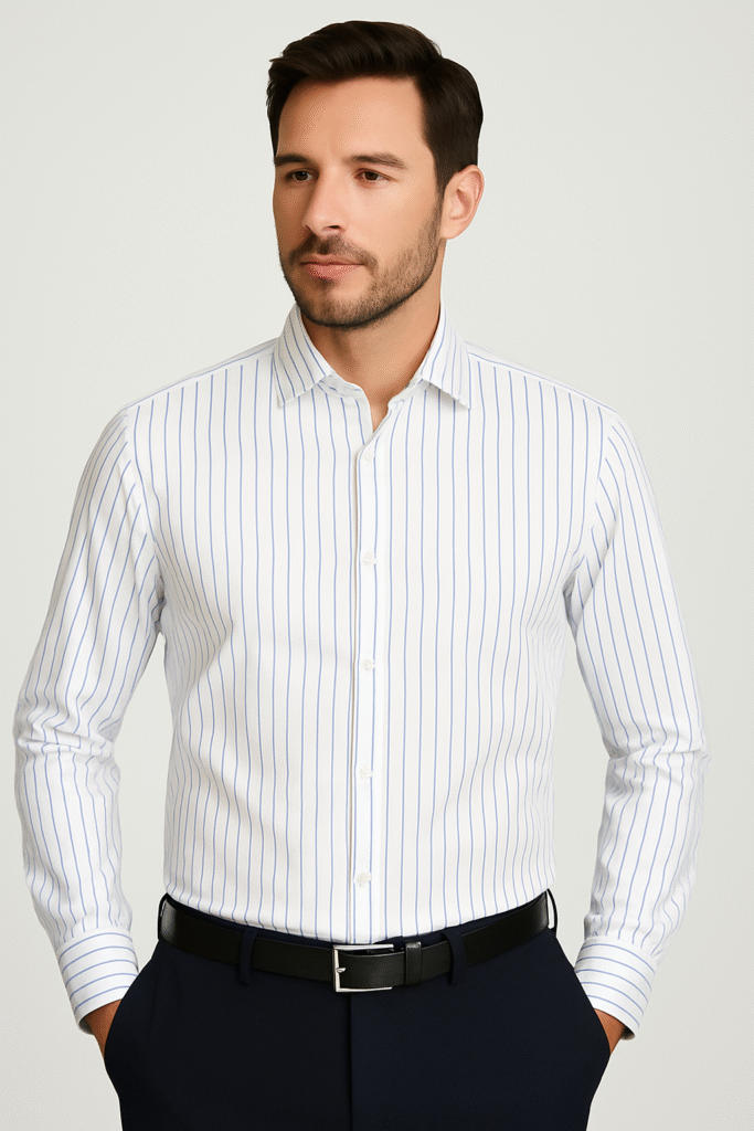 Muška košulja dugih rukava klasičnog kroja, izrađena od elastičnog i prijatnog materijala. Bela podloga sa tankim svetlo plavim vertikalnim prugama daje uredan i elegantan izgled. Idealna za poslovne i smart casual kombinacije.