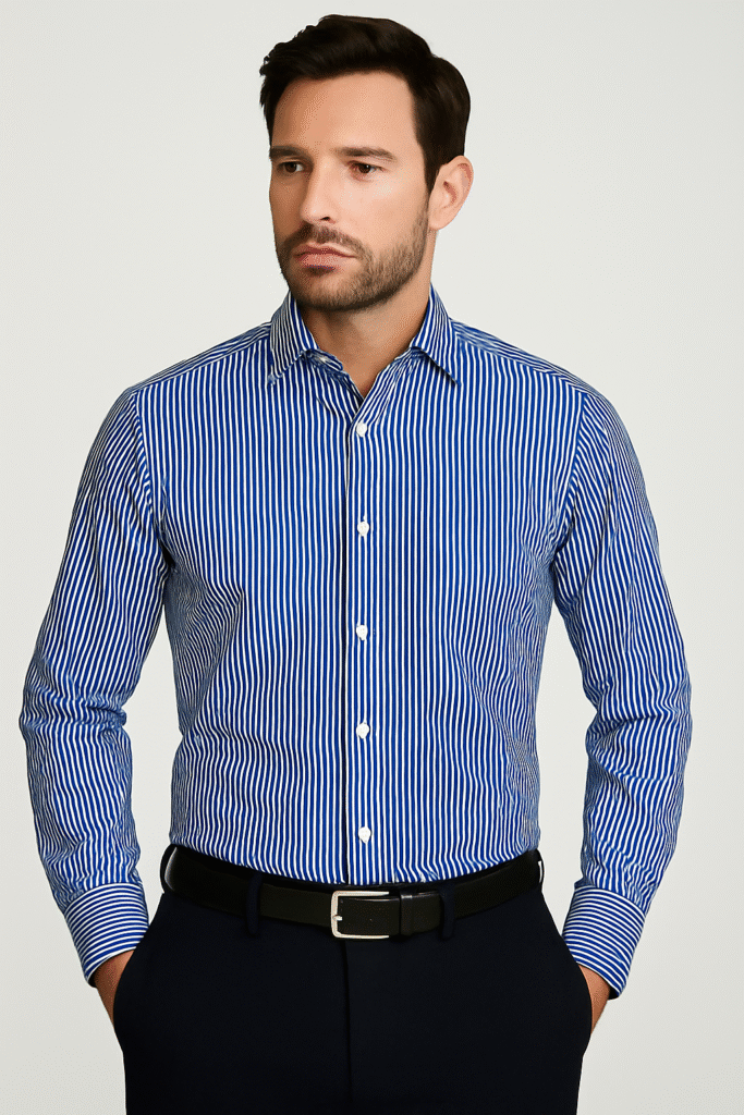 Muška košulja dugih rukava klasičnog kroja, izrađena od elastičnog i prijatnog materijala koji obezbeđuje udobnost tokom celog dana. Bela osnova sa tankim tamno plavim vertikalnim prugama daje čist, uredan i elegantan izgled. Pogodna za poslovne kombinacije, ali i za smart casual stil