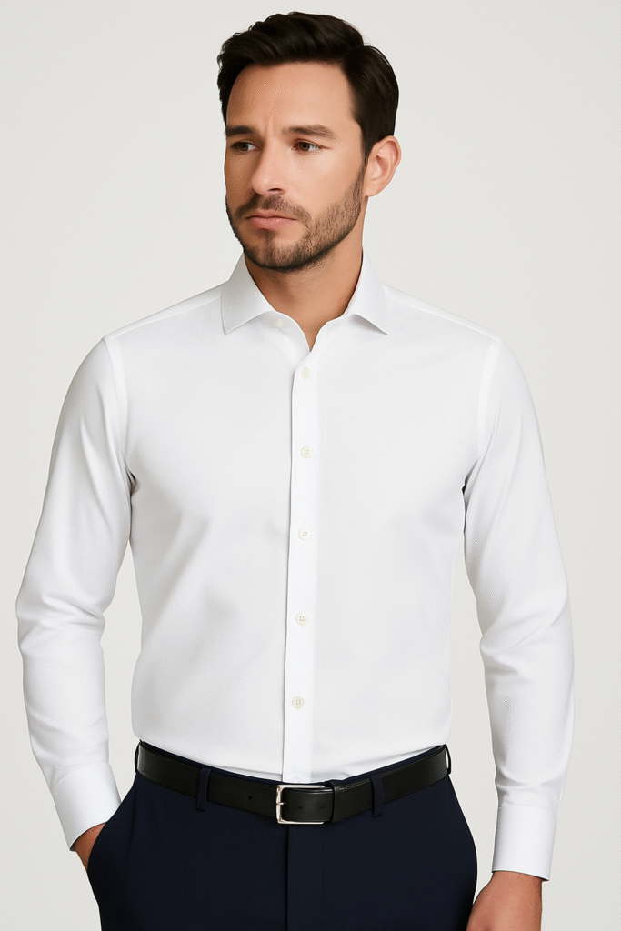 Muška košulja dugih rukava klasičnog kroja, izrađena od kvalitetnog i prijatnog materijala sa blagom elastičnošću. Jednobojna bela košulja čistog i svedenog izgleda, bez ikakve šare ili pruga. Namenjena je poslovnim, formalnim i elegantnim kombinacijama.